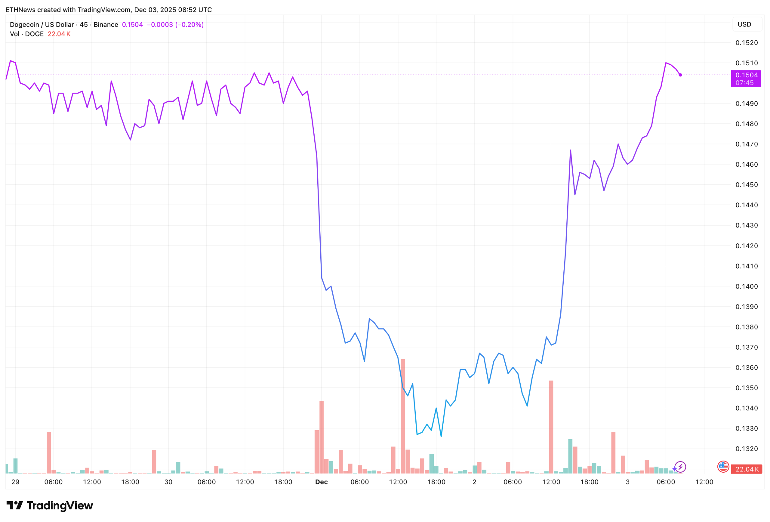 但价格走势迅速逆转。买盘激增推动DOGE走高,重新站上0.1350美元关口,并持续维持上行态势至12月3日。这波复苏使币价重回约0.1500美元——这是自破位后的最高水平。