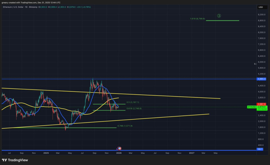 在周线时间框架上,ETH正在形成头肩底形态。左肩出现于2024年中,头部形成于2025年初,右肩于同年第四季度构筑。颈线划设在5000美元关口下方。当前价格位于右肩底部区域。