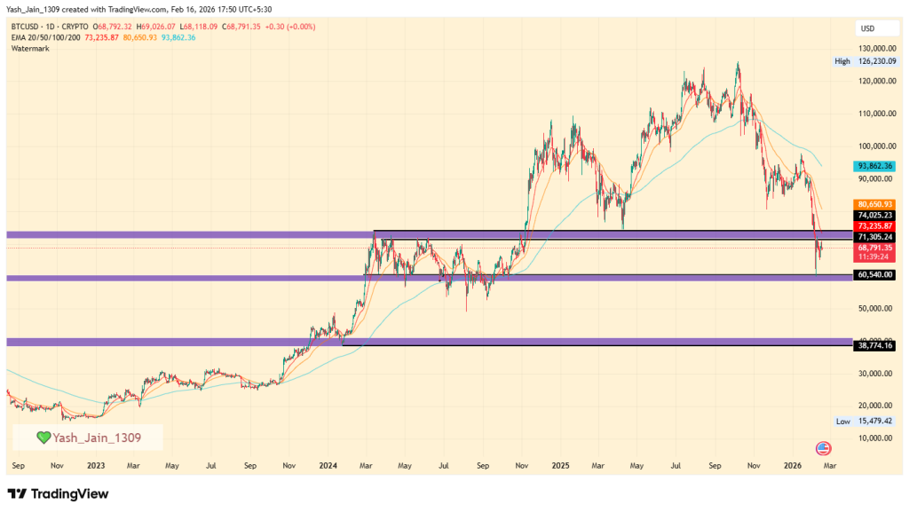 从技术角度看,比特币价格图表处于拐点。68,820美元水平反映市场尚未决定性重拾上涨动能,也未进入新一轮投降。