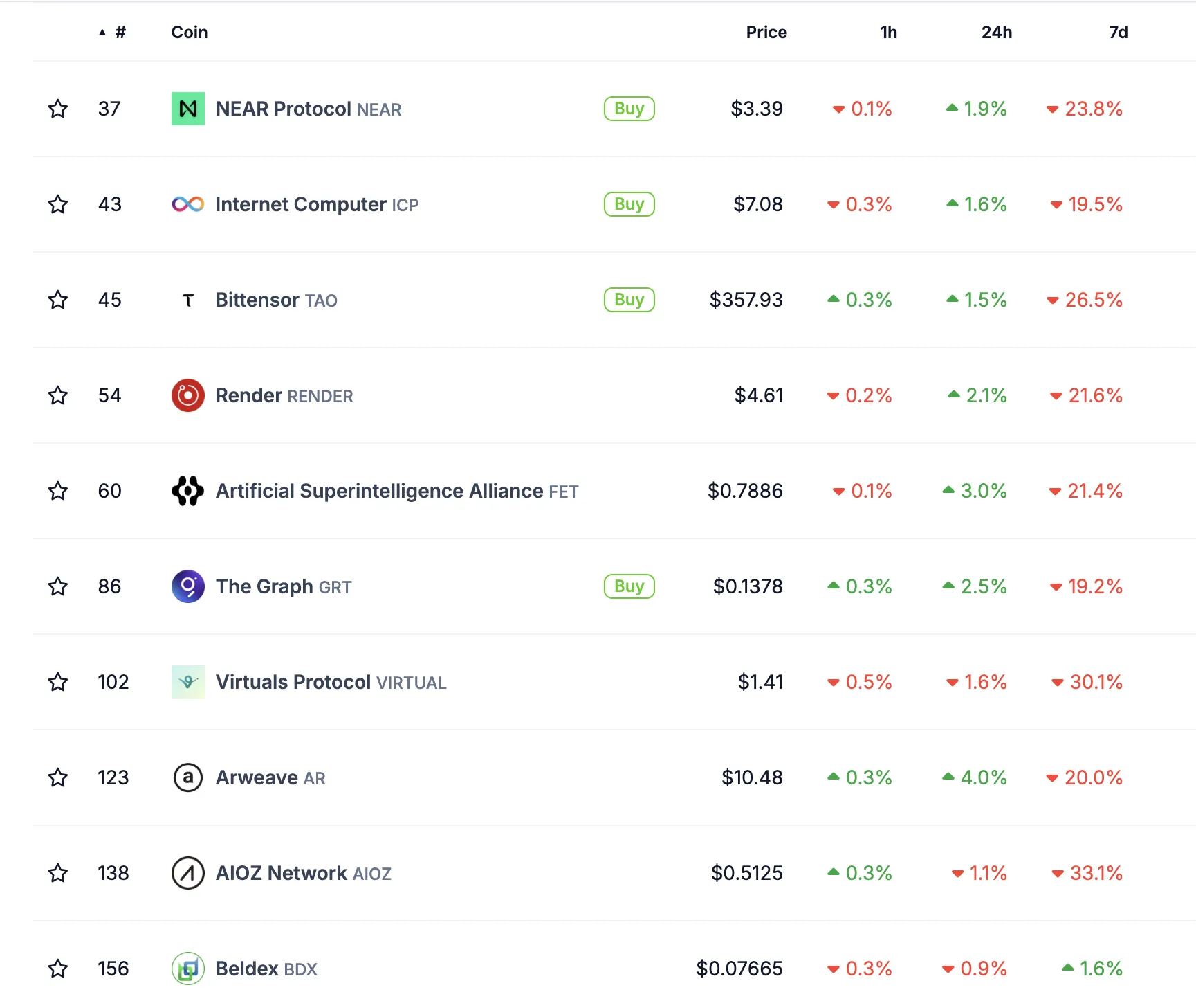 Tether进军AI领域之际,AI加密行业正经历下行周期。CoinGecko数据显示,过去24小时内AI加密市场市值下跌9.1%,目前为290亿美元。