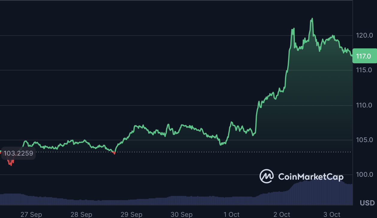 莱特币虽不常登头条,但近期重回117.06美元意义重大。尽管日内下跌0.64%,周跌幅1.15%,但月涨幅达13.18%。其作为可靠交易资产的持久声誉使其保持竞争力,尤其在ETF寻求多元化资产组合时。