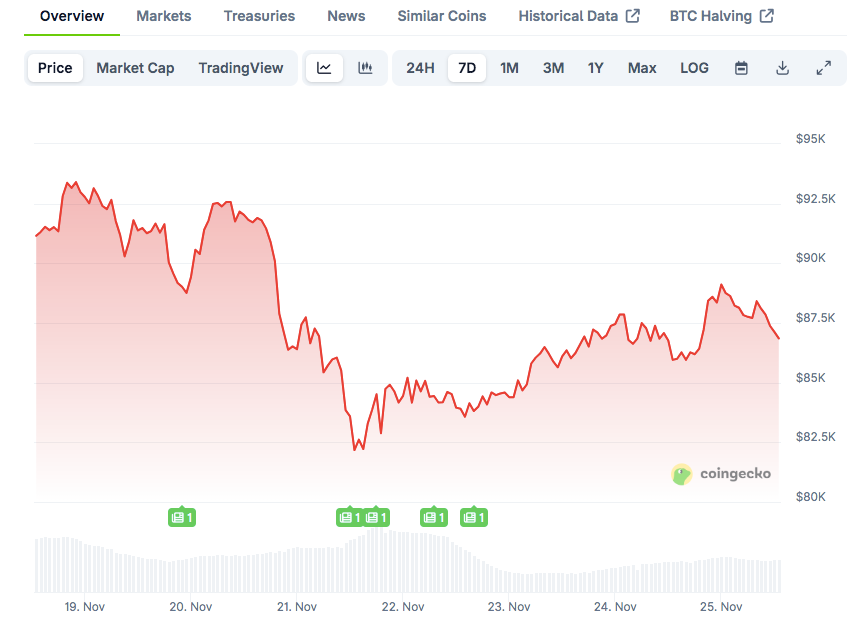 经历周末小幅回升后,比特币周一早间交易于86,000美元附近。该数字资产上周五收盘价约为84,535美元。根据CoinGecko数据,截至发稿时比特币交易价格为86,844.85美元,24小时交易量超过720亿美元。过去24小时价格微涨0.34%,但周跌幅仍达4.76%。
