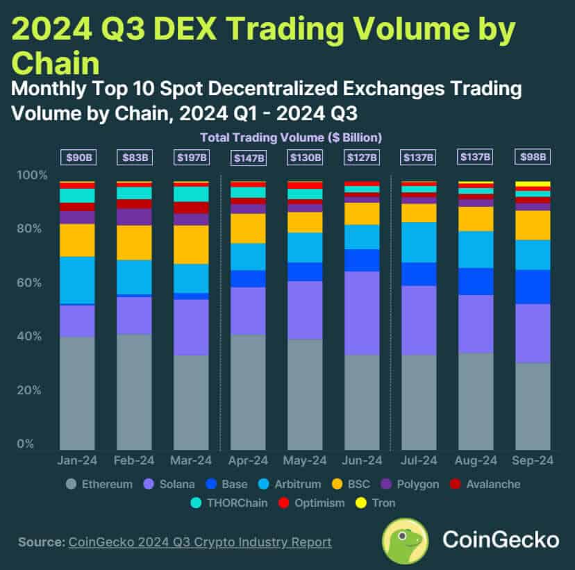 根据10月14日发布的CoinGecko第三季度加密货币行业报告,以太坊在去中心化交易所(DEX)领域的主导地位正面临挑战。尽管以太坊仍然是DEX交易的主导链,但其市场份额在整个季度中持续低于40%。