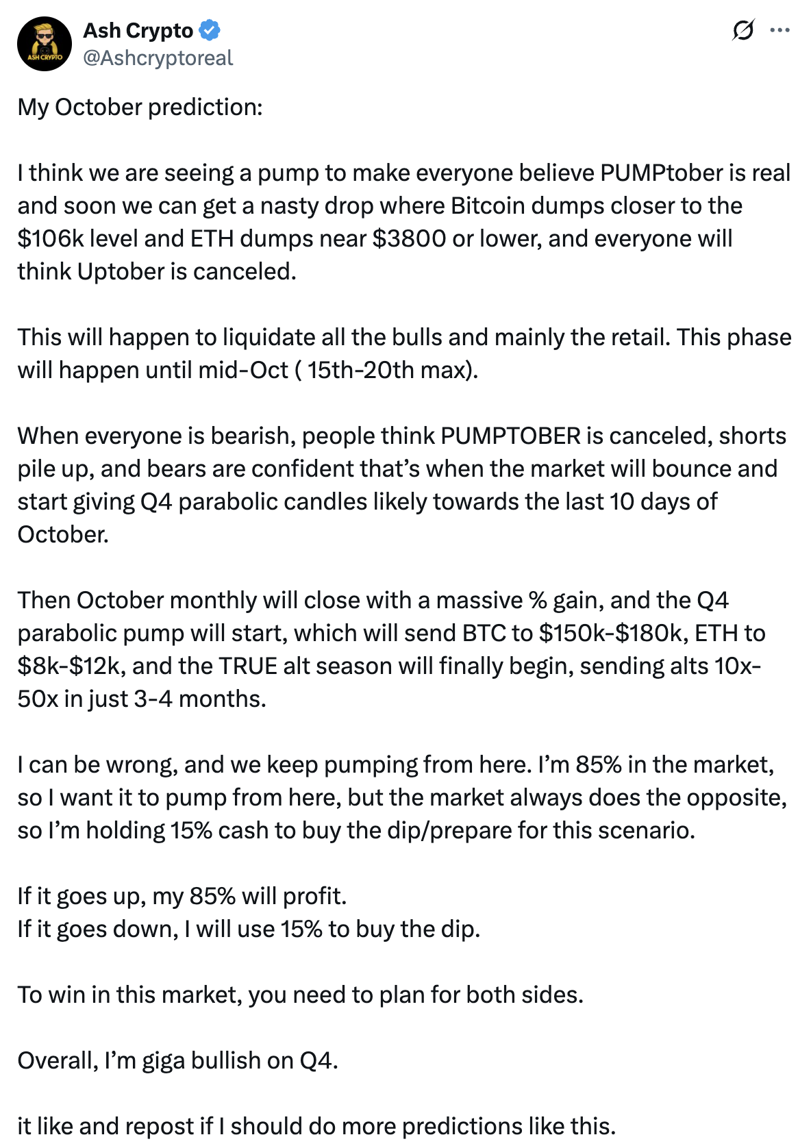 十月在加密货币市场素有"暴涨十月"(Uptober)之称,这个时期往往与资产价格上涨相关联。然而知名分析师Ash Crypto发出警告,指出早期震荡可能打破这种乐观趋势。他通过社交媒体表示,虽然市场乐观情绪可能持续到月中,但短暂回调或将淘汰大量散户投资者。他强调这次调整后,月底可能出现强劲反弹。