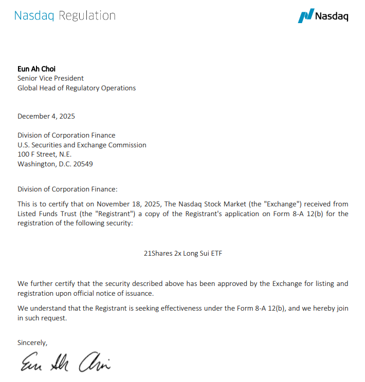 根据美国证券交易委员会最新备案文件,Listed Funds Trust为其21Shares 2倍做多Sui ETF提交的8-A表格已自动生效。这意味着该ETF正式获准在纳斯达克挂牌交易,备案中明确声明:“我们进一步确认上述证券已获交易所批准,将在正式发行通知后完成上市注册。”这标志着首只提供受监管SUI加密货币杠杆敞口的ETF诞生,SUI价格随之反弹超3%,突破局部趋势线。