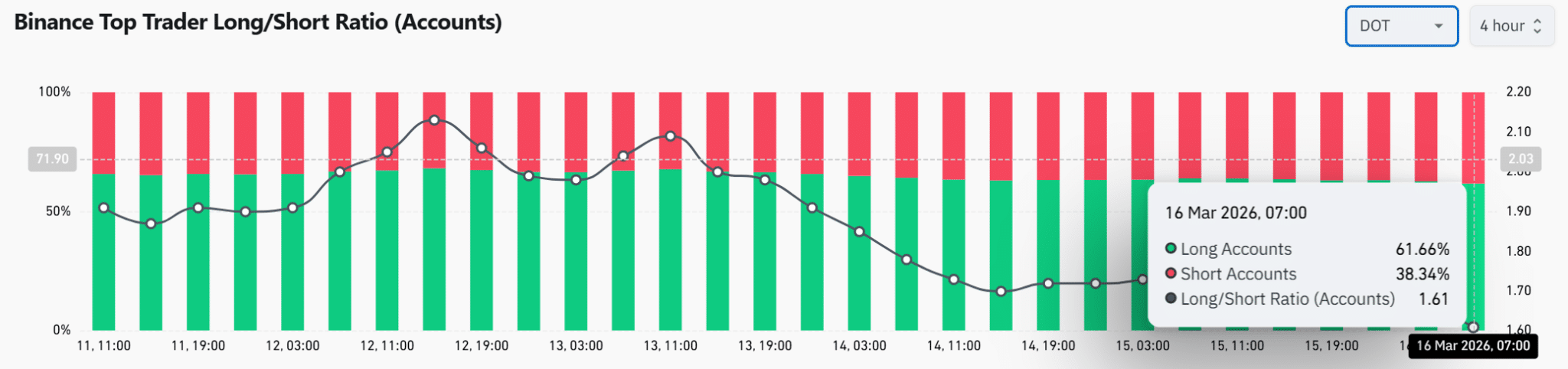 衍生品统计数据进一步佐证了乐观情绪。根据币安顶级交易员持仓数据,目前约61.66%的账户持有多头头寸,而空头账户仅占38.34%。这导致多空比达到1.61,表明经验更丰富的交易员正强烈押注当前DOT涨势将持续。
