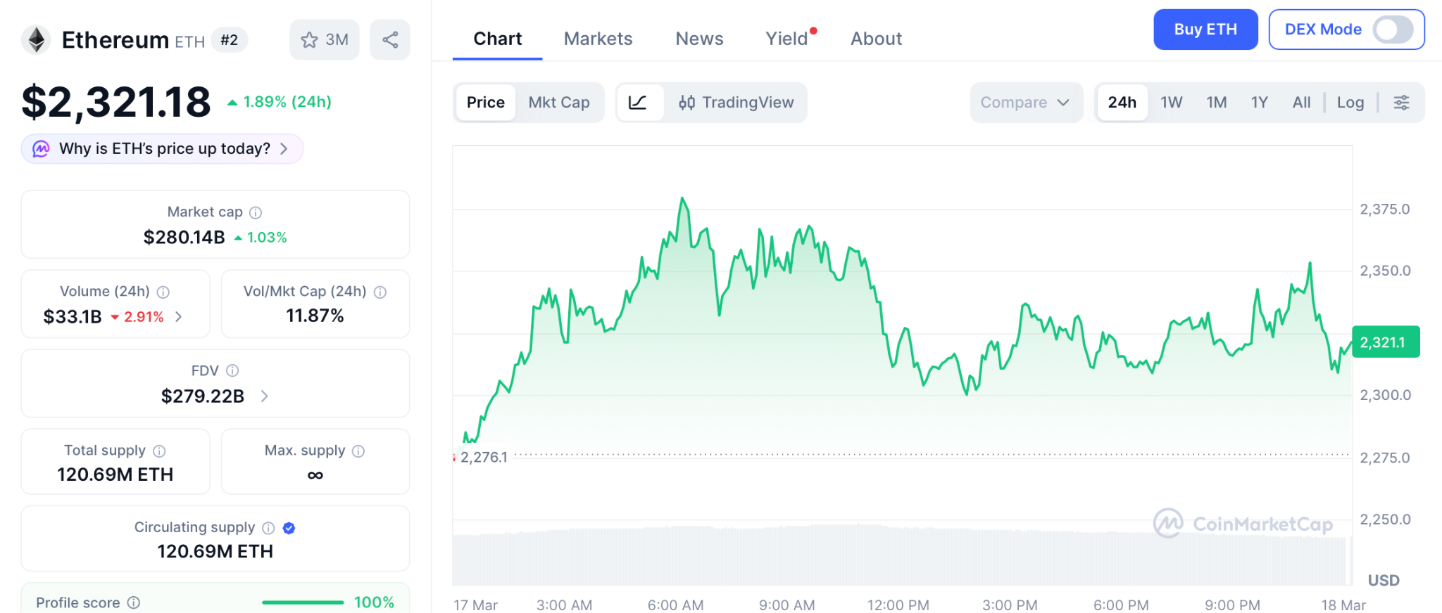 以太坊再次展现了其实力,单日飙升 1.89% 后,于 3 月 17 日升至 2321 美元。这引发了等待复苏信号的投资者新一轮的看涨情绪。