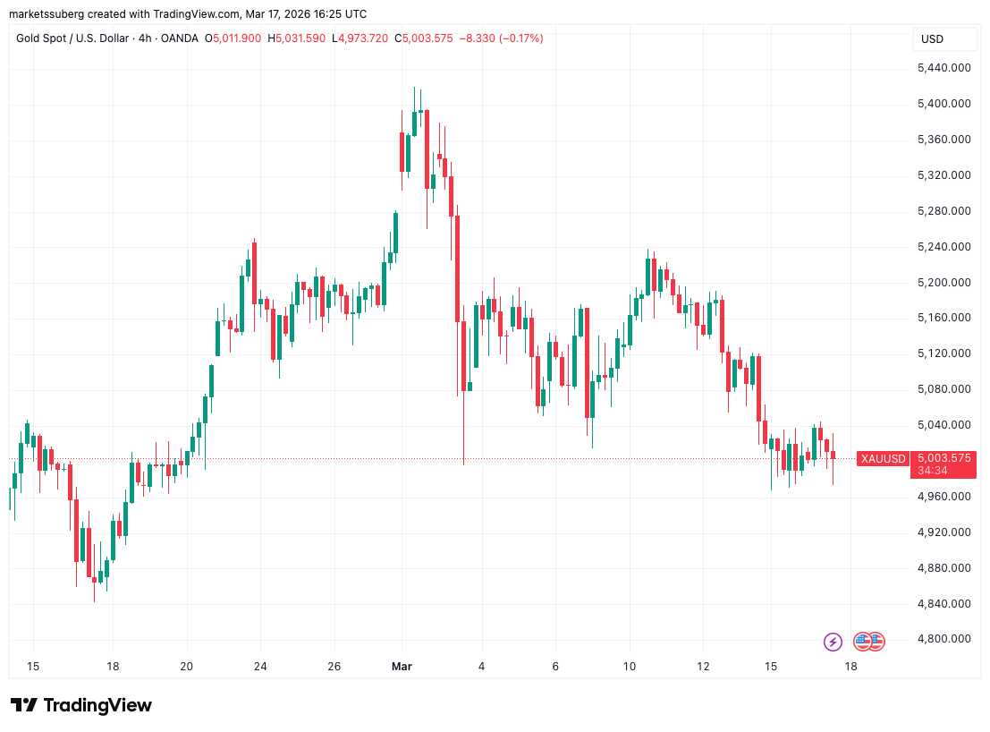 黄金持续走弱,面临失守每盎司5000美元支撑位的风险。