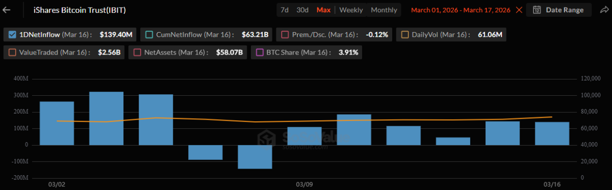 自2024年1月BlackRock的iShares比特币信托推出以来,已过去两年多。截至SoSoValue数据,该基金累计净流入已达632.1亿美元。自3月9日起,IBIT基金每日均实现资金净流入。