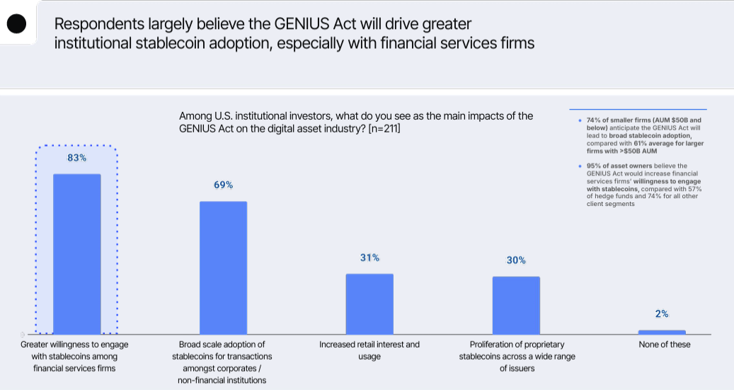 这一趋势部分受到美国监管进展的推动:83%的受访者认为《GENIUS法案》的通过将提高金融机构参与稳定币业务的意愿;超过三分之二(69%)的受访者表示,该法律将推动基于稳定币的交易更广泛地普及。