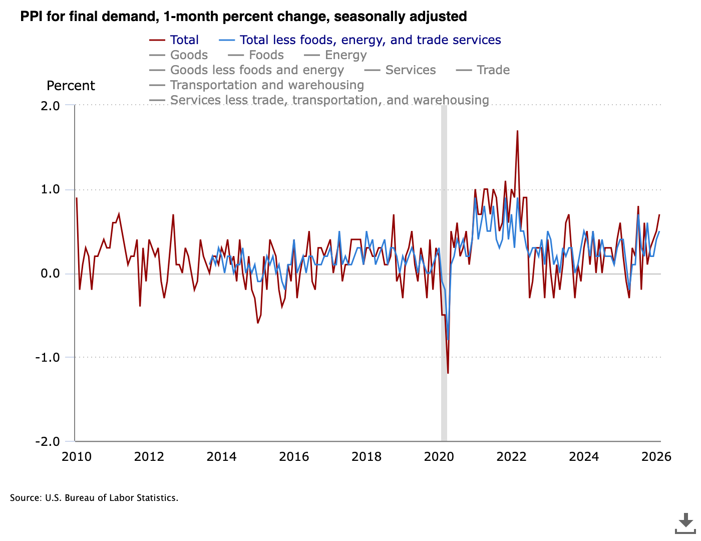 此次PPI数据显著超出预期,环比增长0.7%,同比增长3.4%,延续了近月来的上升趋势。市场此前预测值分别为0.3%和3%。美国劳工统计局官方声明确认:"经季节性调整,最终需求指数在截至2月的12个月内上涨3.4%,为2025年2月上涨3.4%以来的最大年度涨幅。"
