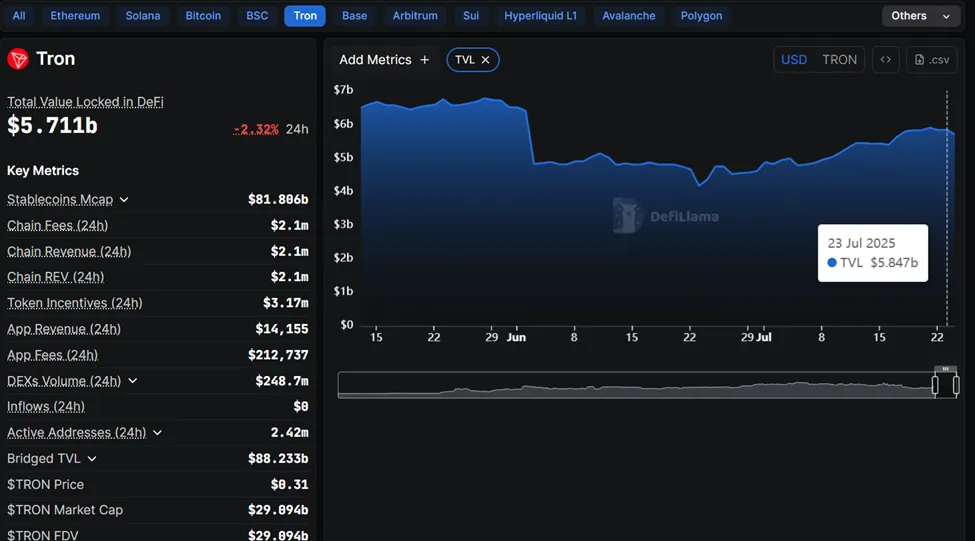 尽管活动宣传声势浩大,波场TVL仍缩水1.36亿美元,从公告日的58.47亿美元降至撰稿时的57.11亿美元。TVL下降暗示网络流动性正在转移。