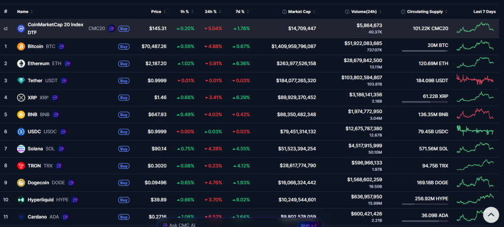 截至2026年3月19日,Hyperliquid的市值稳固在约109亿美元,而卡尔达诺则滑落至第11位,估值约为104.5亿美元。
