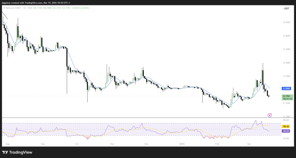 目前Pi币交易价格约为0.17美元,正处于一条关键移动平均线阻力位下方。RSI指标接近中性,显示市场方向尚未明朗。换言之,Pi币价格虽仍显弱势,但可能正在构筑底部。