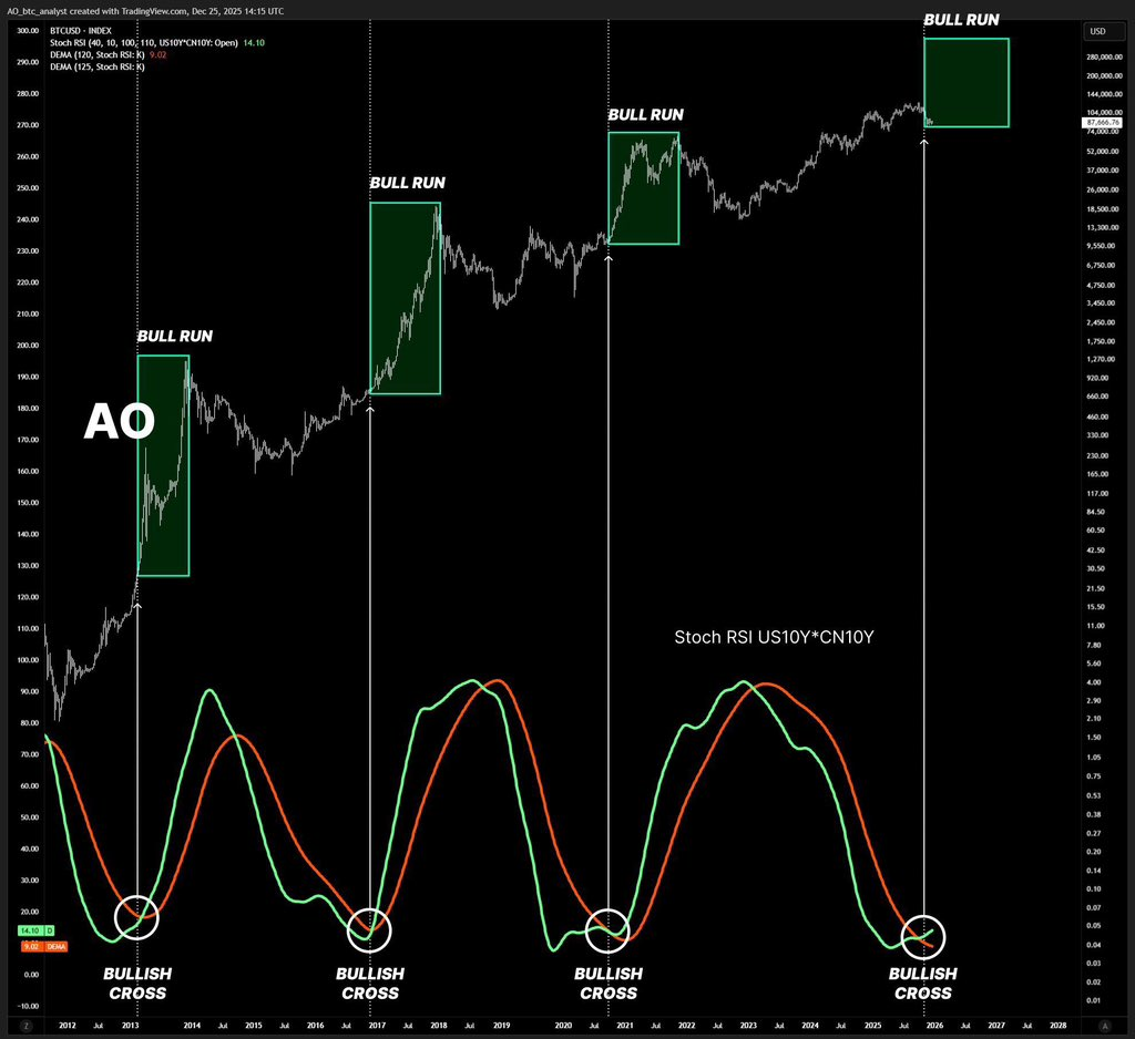 另一值得关注的因素来自长期指标。趋势分析显示,随机相对强弱指数的金叉现象多次与主要牛市启动阶段重合。历史图表呈现三个明确节点:2012年(比特币从15美元迈向1,000美元)、2016年(冲高至20,000美元前)以及2020年(触及69,000美元前)。