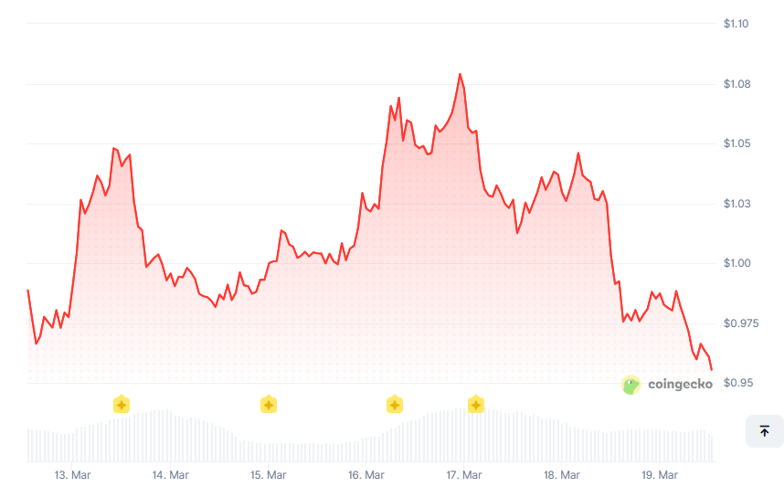 3月19日,SUI交易价格约0.96美元,在今年开局动荡后,正在关键心理价位附近盘整。该网络拥有真正的优势:并行交易处理、基于Move语言构建的开发者友好架构,以及最近由SuiUSDe稳定币推出而锚定的不断扩展的DeFi生态系统。