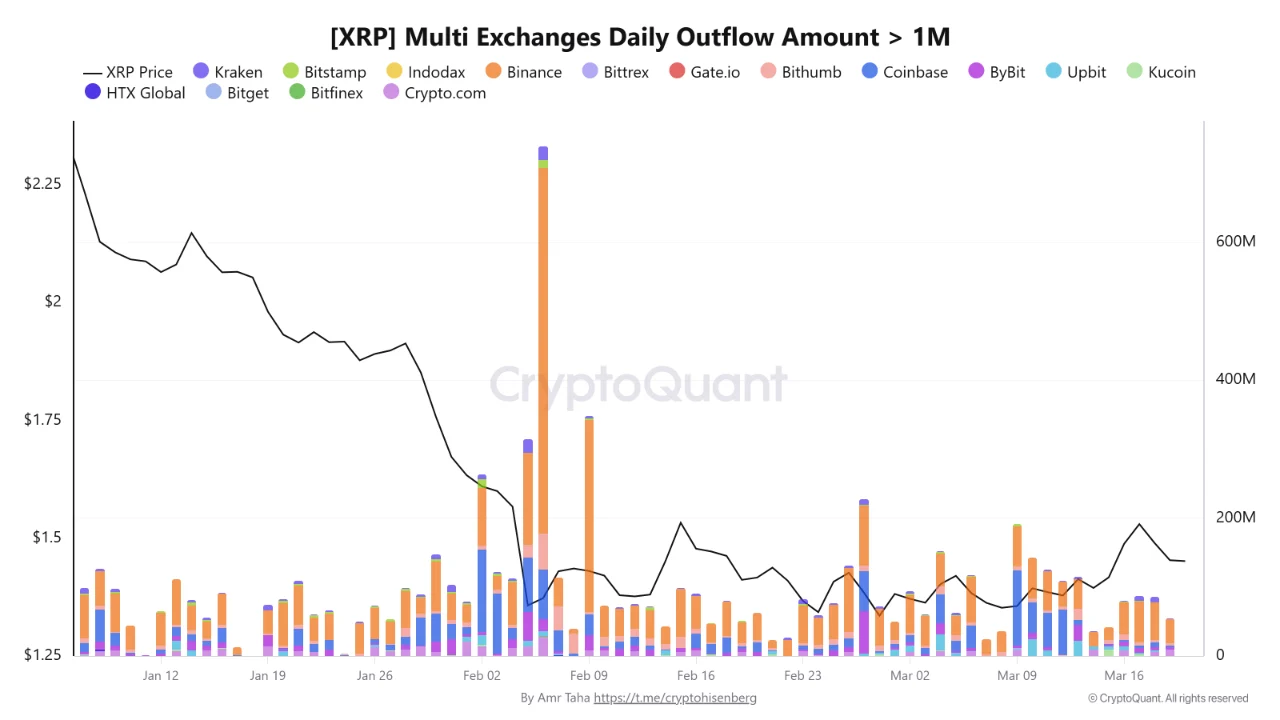 从3月中旬开始,图表显示币安再次引领每日超过100万枚XRP类别的流出,每日总量回归至约5000万枚XRP的基准线。同期其他交易所贡献较小但持续的量值,维持着广泛的多交易所提现活动模式,而非集中在任一替代平台。
