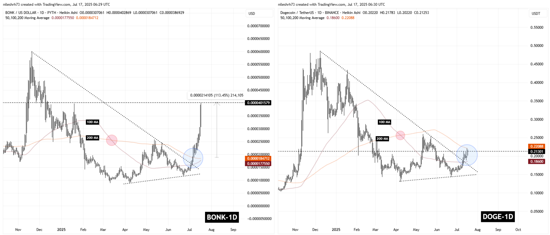 将BONK与DOGE的日线图并列对比可见近乎镜像的形态结构。BONK此前突破长期下降趋势线,收复100日均线后,强势冲破200日均线阻力。该突破触发113%的暴涨行情——且上涨仍在持续。目前DOGE似乎正在遵循同样的路径。