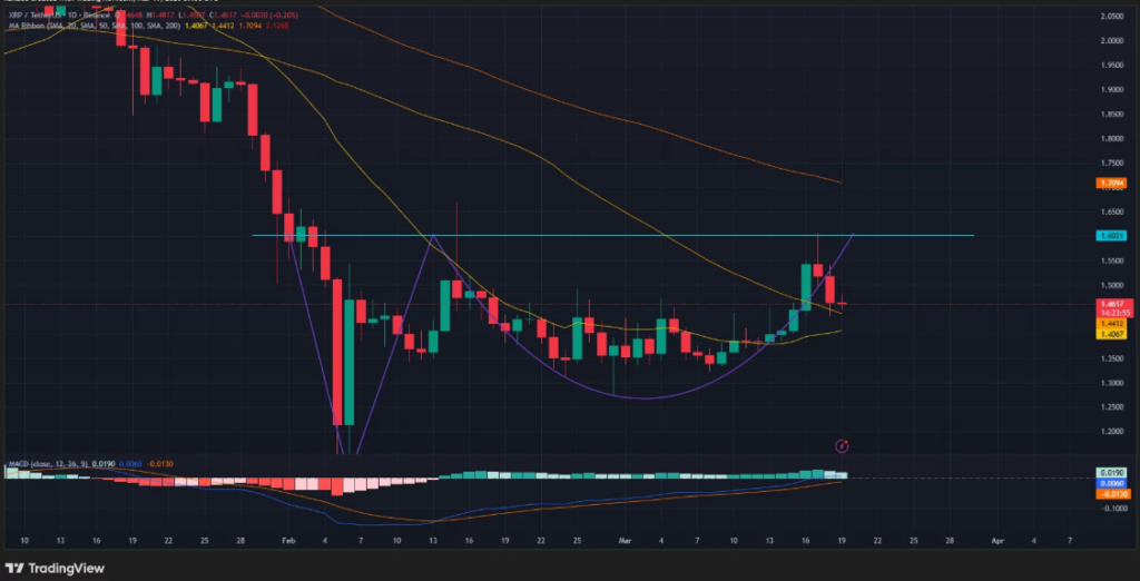在日线图上,XRP已形成“亚当与夏娃”底部形态,交易者通常将其视为看涨反转信号。然而价格在测试1.60美元附近的颈线后近期出现回落。若确认突破该水平,可能引发新一轮上涨动能。