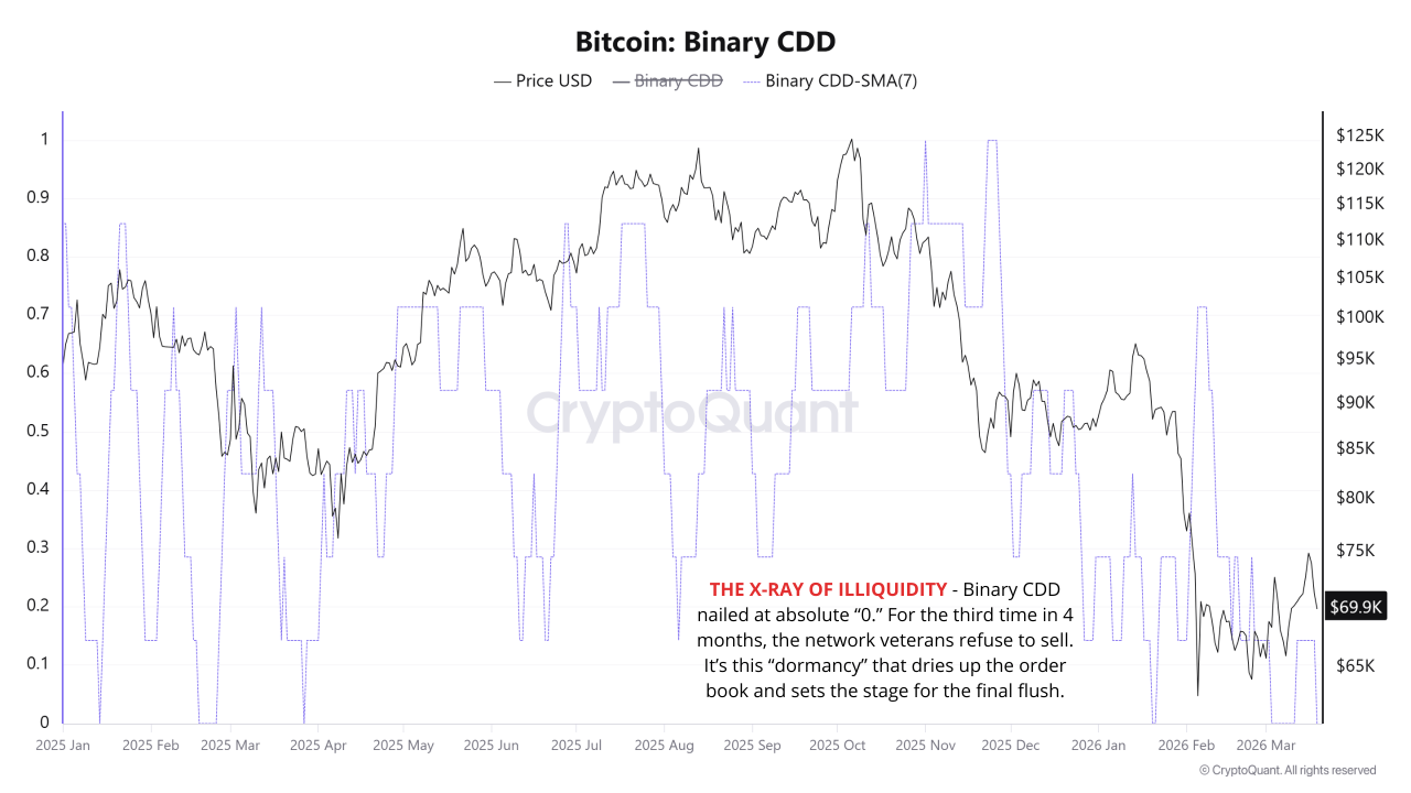 二元CDD指标本期读数归零。该指标追踪长期休眠的比特币是否在特定日期流通,零值确认长期持有者未移动仓位。这减少了市场可用流动性,使价格容易急剧下跌。