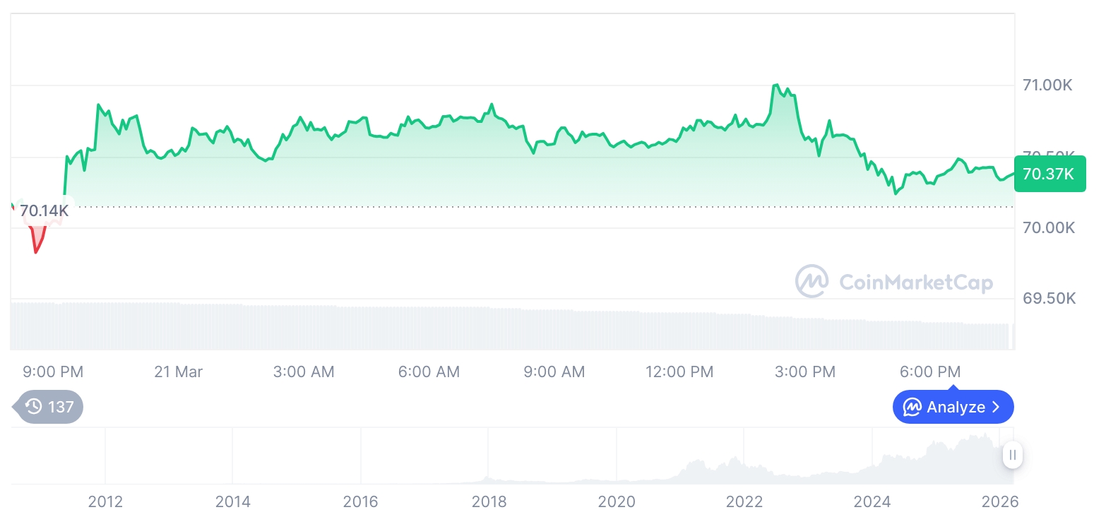 据CoinDesk报道,价值135亿美元的加密货币衍生品将于3月27日在Deribit到期,持仓情况显示市场更倾向于波动性而非方向性交易。根据CoinGecko数据,3月21日BTC交易价格为70,500美元,DOGE为0.09美元。