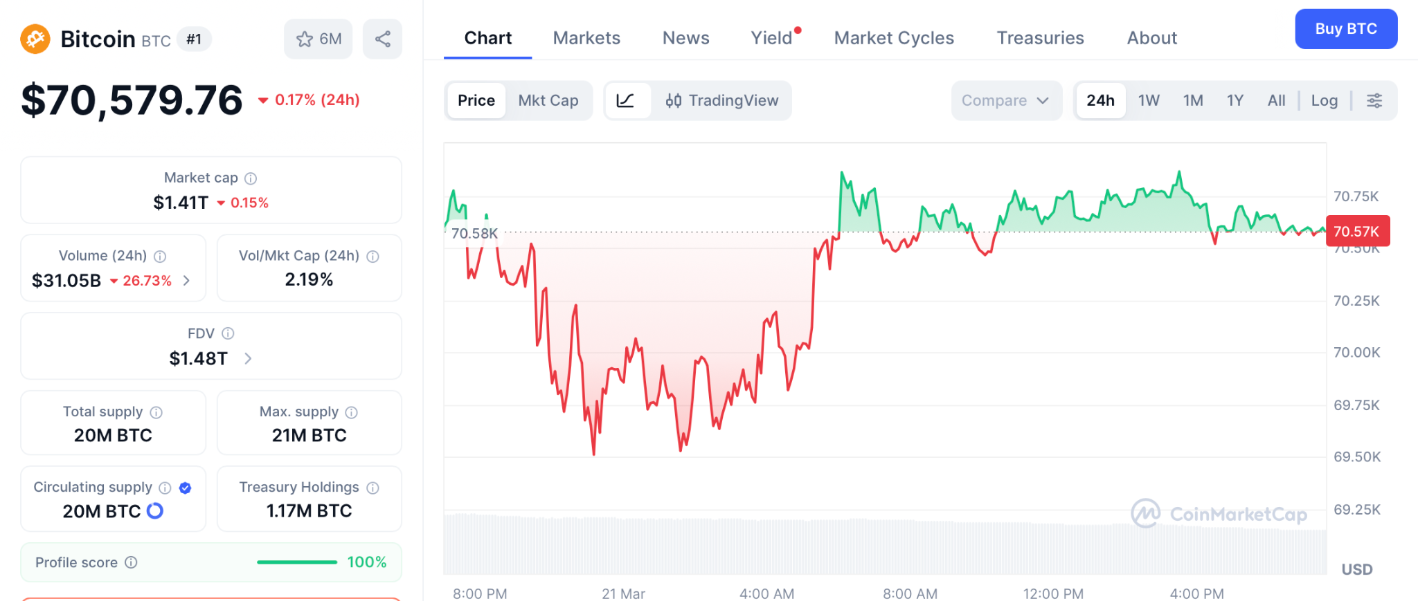 根据CoinMarketCap数据,3月21日BTC交易价格为70,579美元。摩根士丹利已提交其现货比特币ETF(MSBT)申请。从70,579美元到花旗集团112,000美元的目标价约有59%涨幅——在整个周期中算是不错的保值选择。