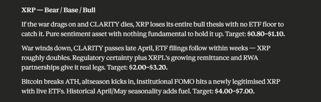 Claude对XRP的分析最为戏剧性,因为其命运几乎完全系于这一项立法。如果法案未通过,XRP ETF的推进将无明确路径,XRP将完全沦为情绪炒作标的。
