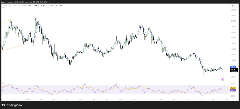 SOL的图表则讲述了一个略有不同的故事。尽管它也从高点回落,但其结构看起来更为健康。SOL价格目前在90美元左右交易,这是一个重要关口。