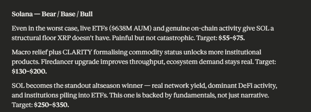即使情况恶化,Solana的价格也不会像XRP那样崩溃。当然,下跌会是痛苦的,但已有太多的机构资金布局其中,使其不至于归零。Claude给出的目标价位:55–75美元。