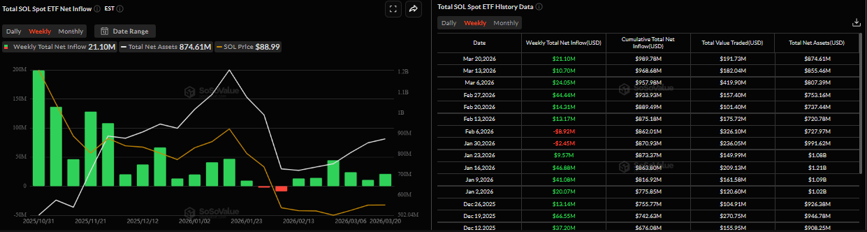 尽管近期价格疲软,专业投资者对索拉纳的兴趣依然浓厚。专注于SOL的交易所交易产品上周吸引了约2100万至2600万美元的净资本流入,根据SoSoValue跟踪数据,这已是连续第六周实现资金净流入。