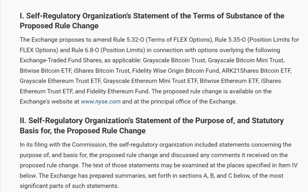 纽约证券交易所关联交易所现已取消针对比特币和以太坊ETF期权的2.5万份合约限制。这一决定出台时,市场对加密货币衍生品的需求正持续增长。NYSE Arca与NYSE American已提交提案,要求取消头寸限制及相关加密货币ETF期权交易约束。