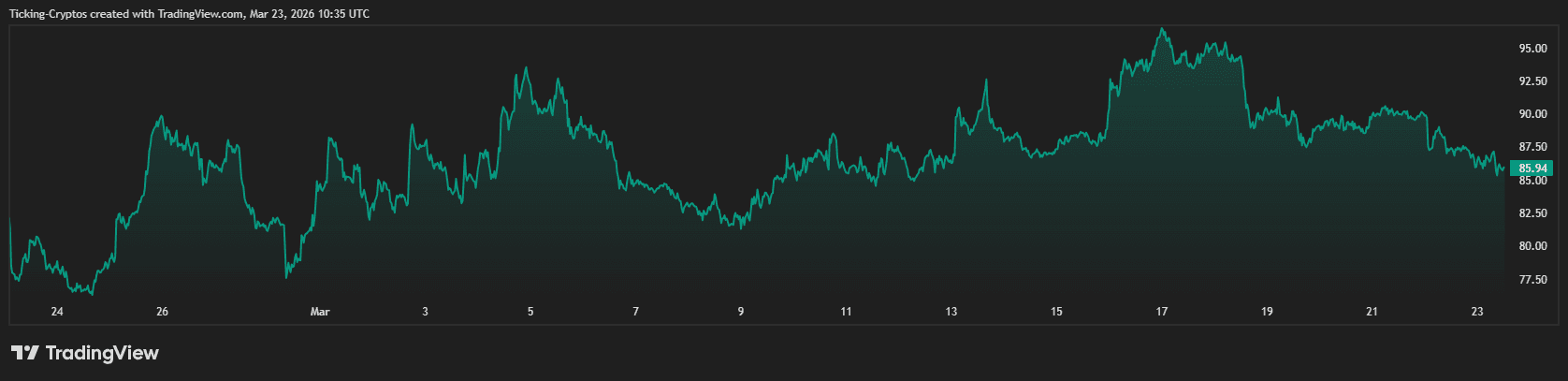 SOL目前徘徊于20日指数移动平均线(88.93美元)附近。维持在此水平上方对保持看涨“偏向”至关重要。50日简单移动平均线(87.23美元)则构成次级安全网。