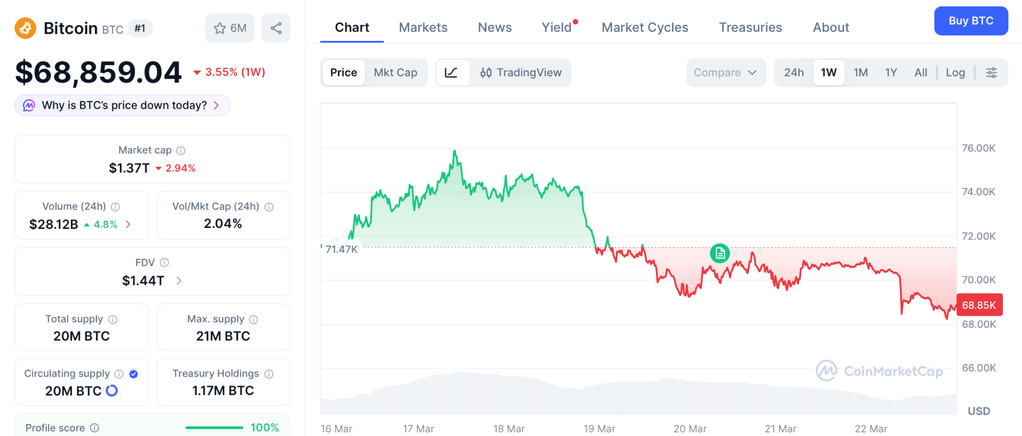 据《财富》杂志援引CoinMarketCap数据,受伊朗袭击能源基础设施影响,比特币在周初触及76000美元后于3月22日跌至68859美元。