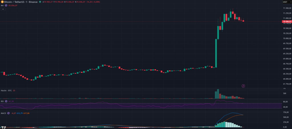 与此同时,加密货币市场对此进展反应积极。比特币在数分钟内上涨4%,触及71000美元;以太坊上涨7%,升至2200美元附近。