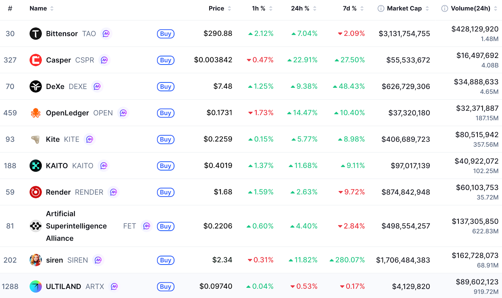 第三个逆势大涨的主要项目是siren(SIREN)——其涨幅惊人。这个链上AI代理平台跃升至榜单前列,将Near Protocol(NEAR)挤出第二位。