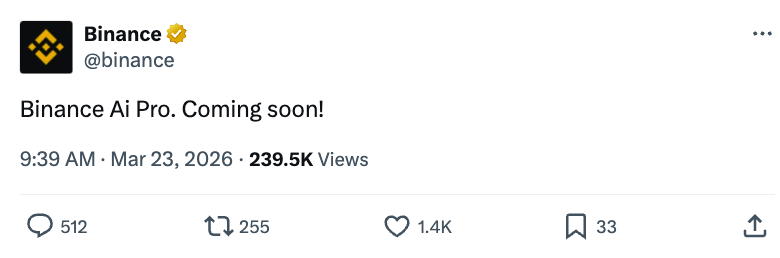 最后,币安以一句简单的“即将推出!”推文预告了其“Binance Ai Pro”,该推文浏览量高达21.7万次,暗示在这股热潮中将推出新的AI交易所工具。