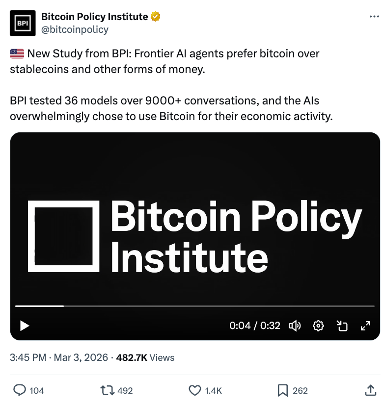 比特币政策研究所(BPI)近期对36个前沿AI模型的研究显示,在经济测试中,超过90%的模型选择了数字原生货币而非法币。比特币成为长期价值存储的首选。