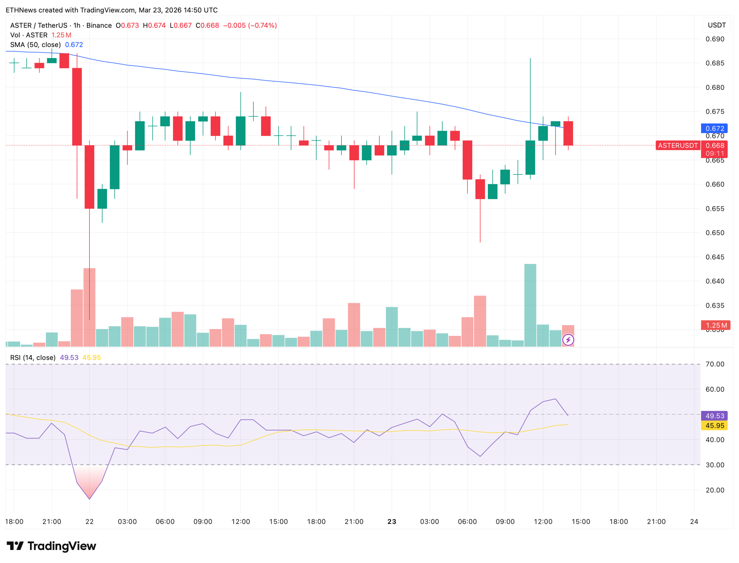 截至撰稿时,ASTER在一小时图表上的交易价格为0.669美元,日内下跌0.59%。覆盖3月21日至3月23日下午的图表显示了完整的两天走势。价格在周六开盘时高于0.685美元,随后在席卷所有主要资产的广泛市场下跌中,于同一交易时段跌至0.655美元附近的低点。从周日到周一上午的后续复苏将ASTER带回到0.670美元至0.675美元的区间,并在过去36小时的大部分时间里在此区域盘整。