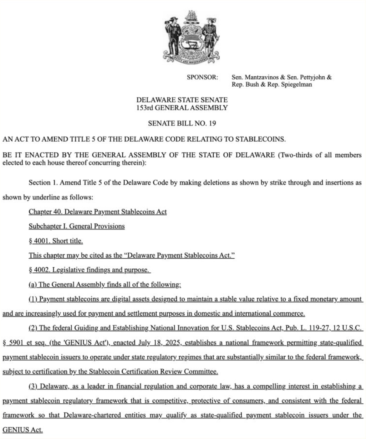 根据相关报道,特拉华州参议院在第153届大会上提出了第19号法案,该法案由参议员曼扎维诺斯和佩蒂约翰与众议员布什和施皮格尔曼共同发起,旨在将《特拉华州支付稳定币法案》作为该州法典第5篇的新章节。此举意在为根据特拉华州特许章程运营的支付稳定币发行方建立州级监管框架,制定与2025年7月18日颁布的《GENIUS法案》所确立的联邦框架相呼应的许可要求和运营标准。