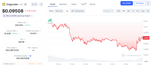 根据CoinMarketCap数据,狗狗币在3月23日的交易价格为0.095美元,较2021年5月0.73美元的历史高点下跌了87%。T. Rowe Price的ETF申请增加了机构层面的关注,但DOGE价格仍低于所有主要移动平均线。多空比率为3.29,显示出尽管图表看跌,市场情绪仍偏向乐观。