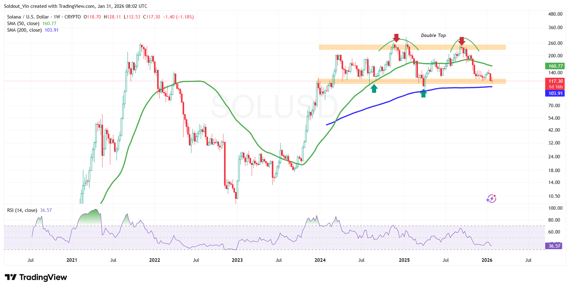Solana价格日内交易区间介于114.83美元低点与118.61美元高点之间,恰好位于双顶形态颈线附近,这在多数情况下是看跌信号。看跌情绪持续,SOL价格在周线图上远低于50日简单移动平均线(SMA),但受当前位于103.91美元的200日SMA支撑,维持在113美元上方。与此同时,Solana的相对强弱指数(RSI)在周线时间框架上持续下降,目前位于36.57并继续下行,表明长期来看空头仍掌控局面。