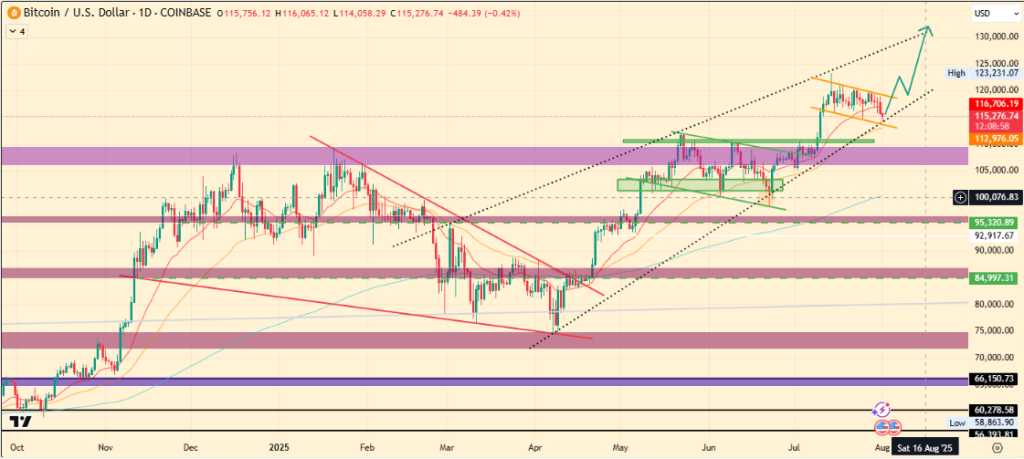 若115,000美元上升楔形支撑有效,旗形形态预示比特币可能突破至13万美元。