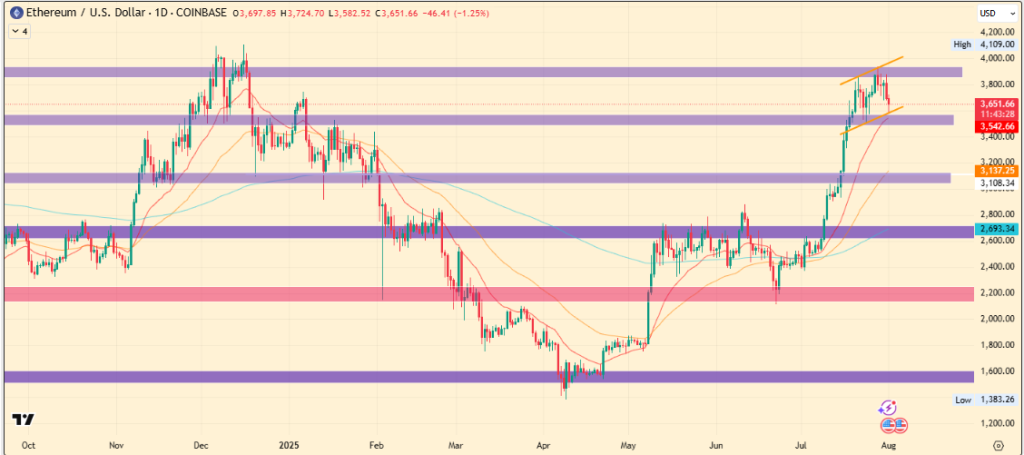 尽管当前回落至3,638美元,只要守住上升通道下轨并维持买盘,以太坊仍可能再次测试4,000美元。