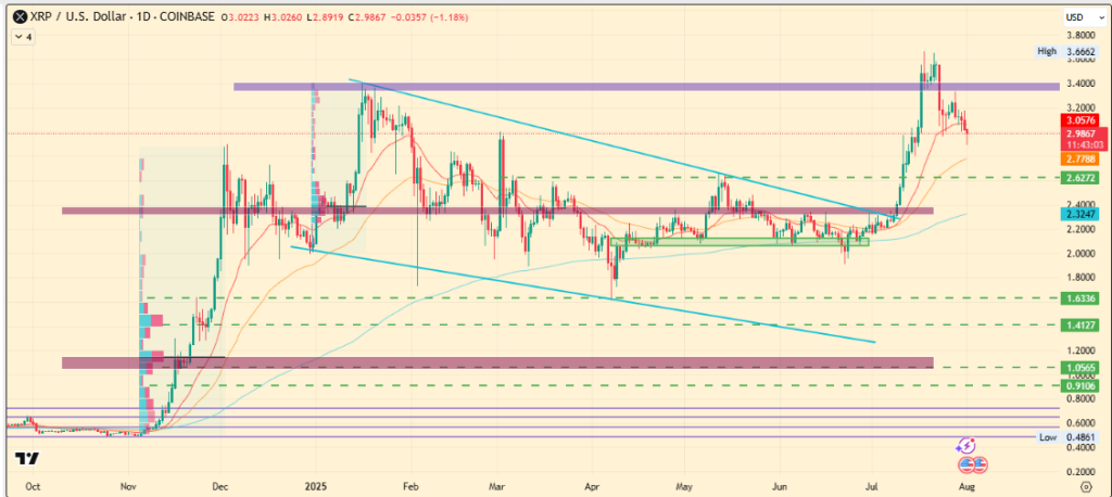 7月瑞波币强势冲高至3.66美元,8月1日回调至2.92美元。由于抛压加剧,其短期牛市特征已转弱,尤其在失守3.0美元关键位后。