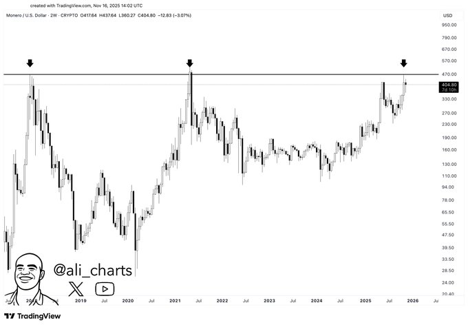 分析师Ali(@ali_charts)指出,XMR当前测试的阻力墙自2018年以来始终未被突破。该资产在形成稳健上升结构后,正重新试探470美元附近的这一关键区域。