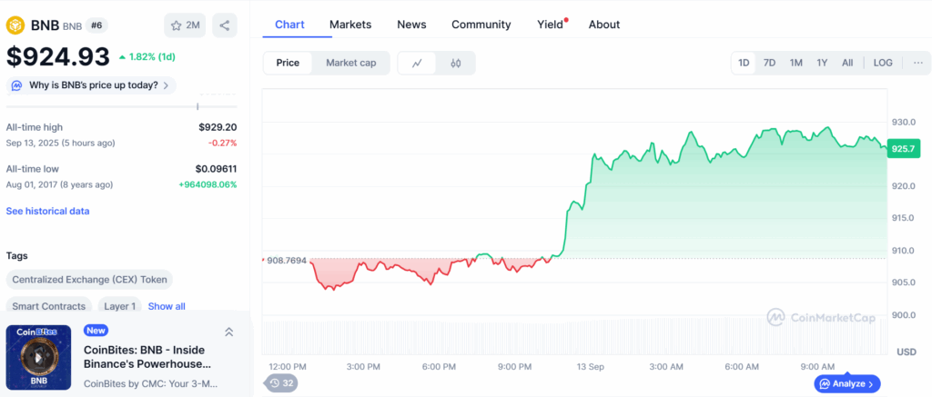 数据显示,BNB在2025年9月13日曾达到929.20美元的阶段性高点,距离本文撰写时不足12小时。当前BNB价格从高点回落0.27%至924.93美元,但过去24小时仍上涨1.82%,周涨幅达7.81%。截至发稿,24小时交易量增长7.93%至25.5亿美元。