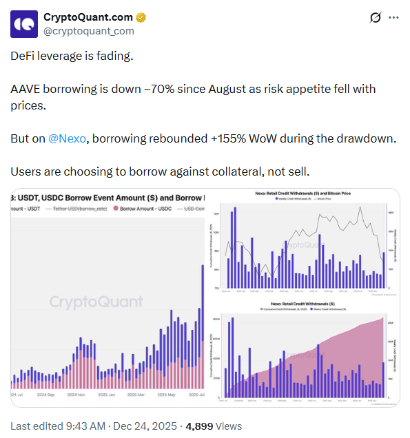 链上数据分析平台CryptoQuant指出,在近期加密货币市场暴跌期间,去中心化与中心化借贷呈现出明显分化。数据显示,像Aave这类去中心化金融(DeFi)平台的借贷规模急剧萎缩。以2025年8月初为例,Aave平台上USDT、USDC等稳定币的周借贷量曾达到62亿美元的峰值,但到11月末已暴跌69%至19亿美元。
