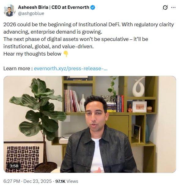 XRP数字资产国库公司Evernorth首席执行官Asheesh Birla在近期一篇推文中预测,2026年将迎来机构级DeFi应用的大幅增长。“2026或将成为机构DeFi的元年,”Birla如是说。这一判断基于监管框架日益明晰以及企业对加密市场需求持续攀升的背景。