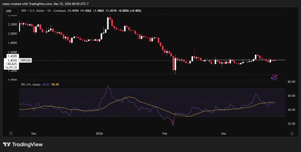 在经历了动荡的一周后,XRP价格现交易于1.42美元左右,较其高点下跌约7%。价格在3月17日曾触及1.60美元,随后卖方压力使其在3月23日跌至1.36美元附近的低点。