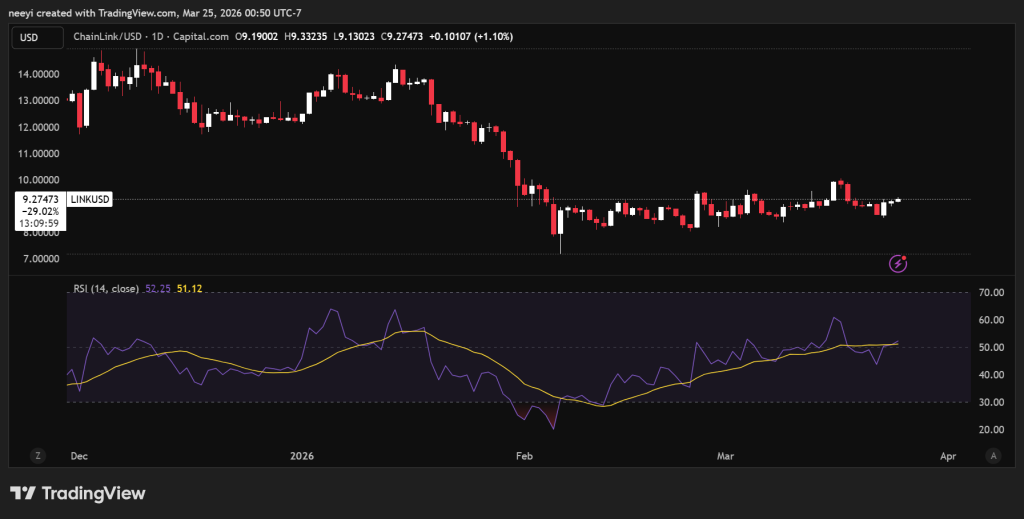 Chainlink价格现交易于9.3美元附近,过去一周下跌约6.94%。价格在3月17日测试9.80美元附近高点后,卖方压力使其跌至8.43至8.57美元区间的低点。